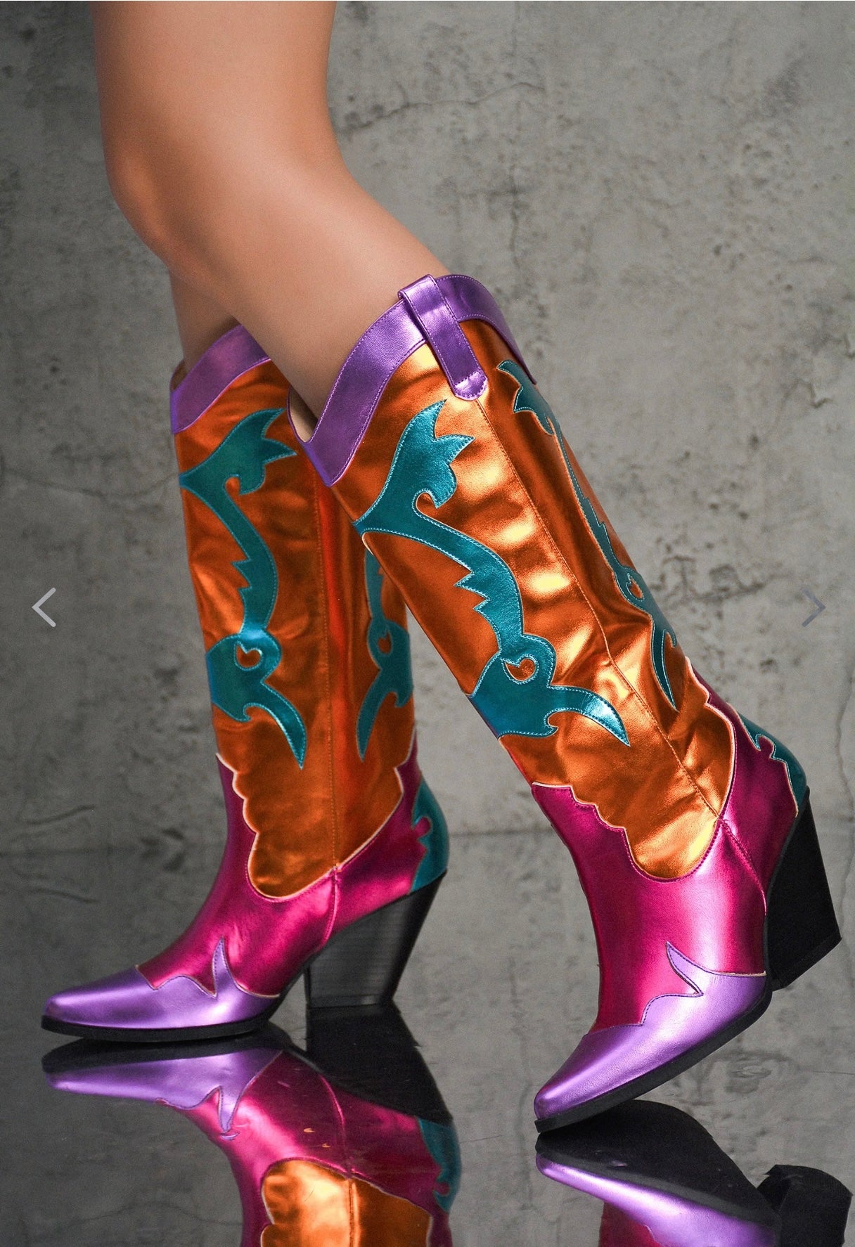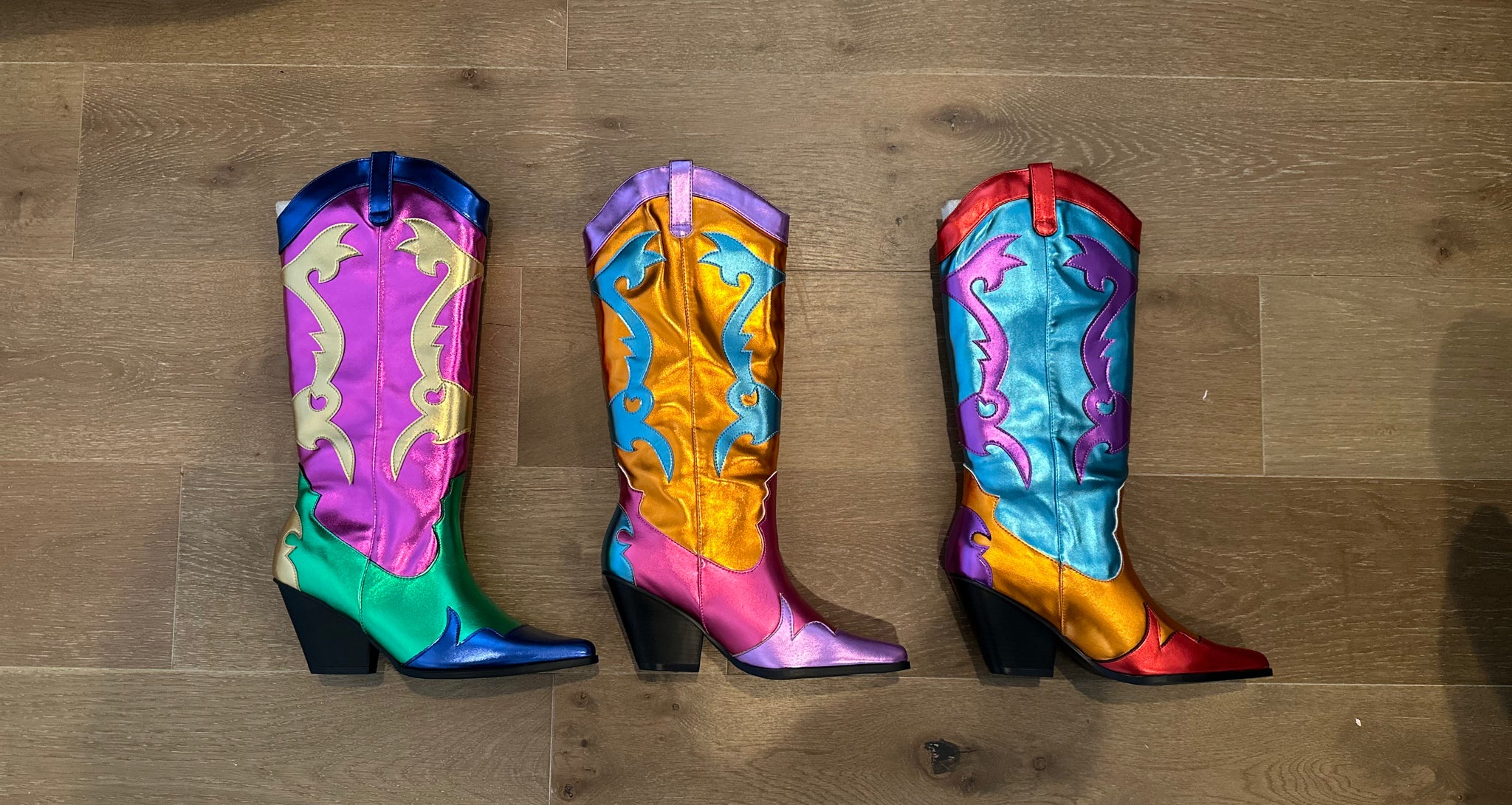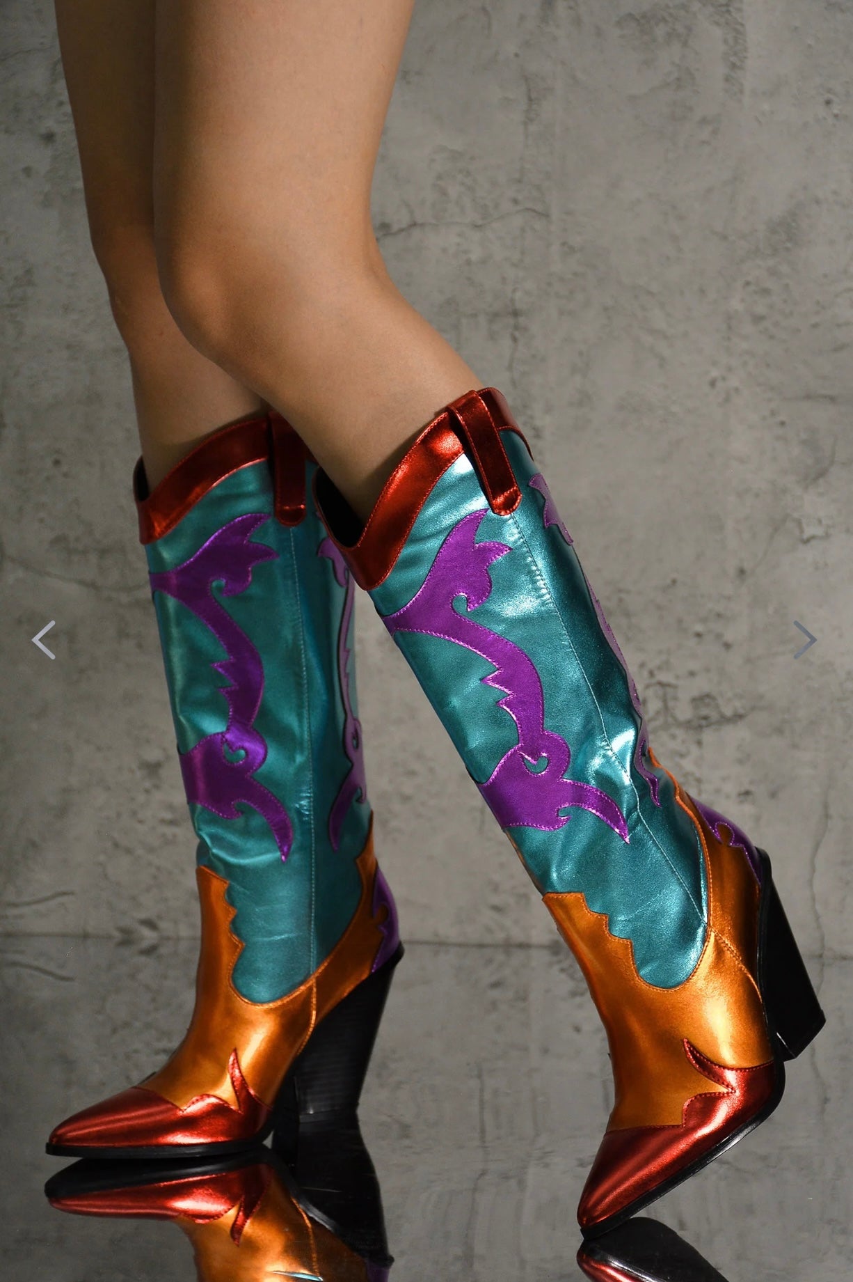 The Rodeo metallic statement boots , features a pointed toe and 3” block heel. Knee high, vegan leather. Limited sizes.